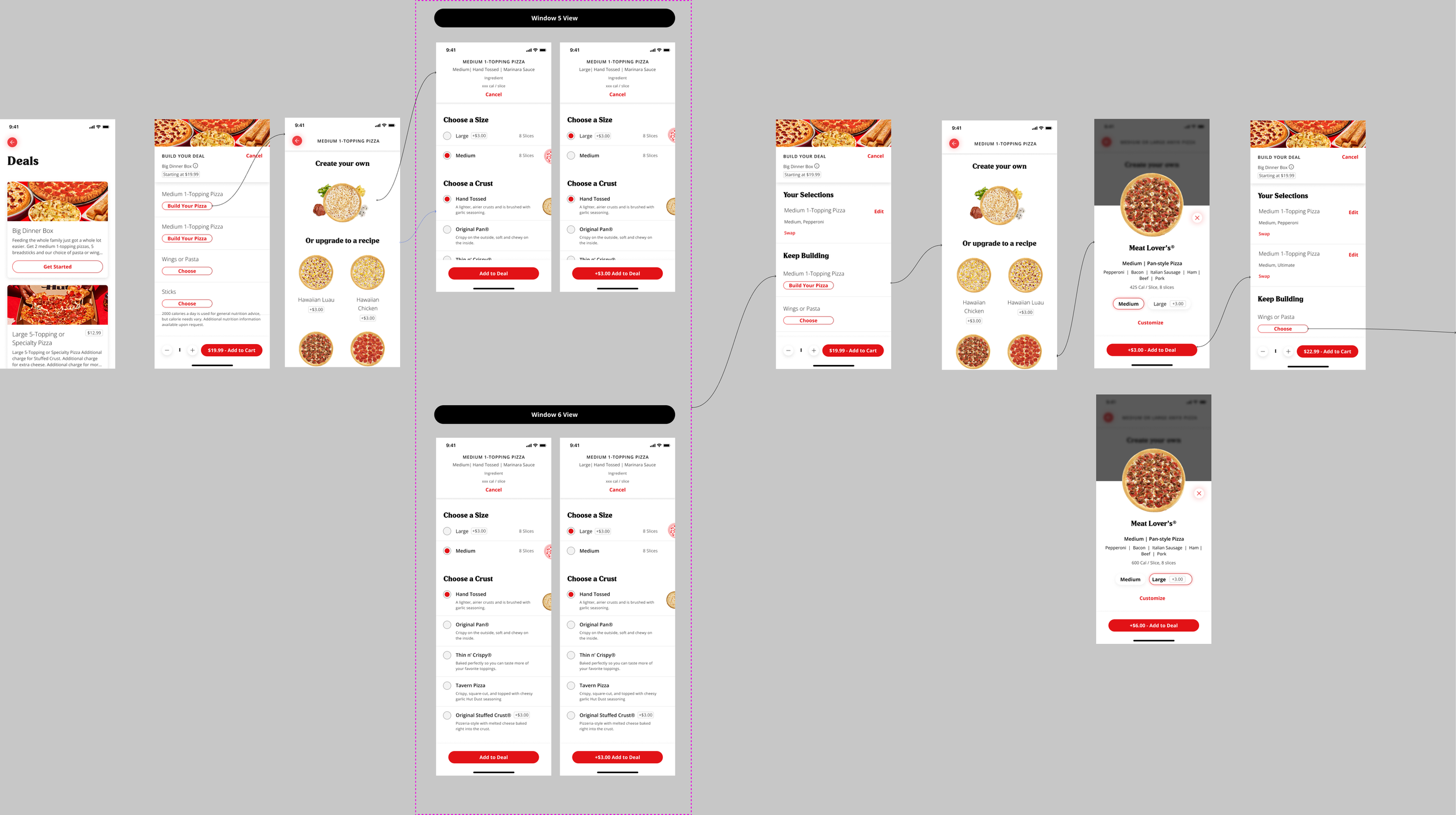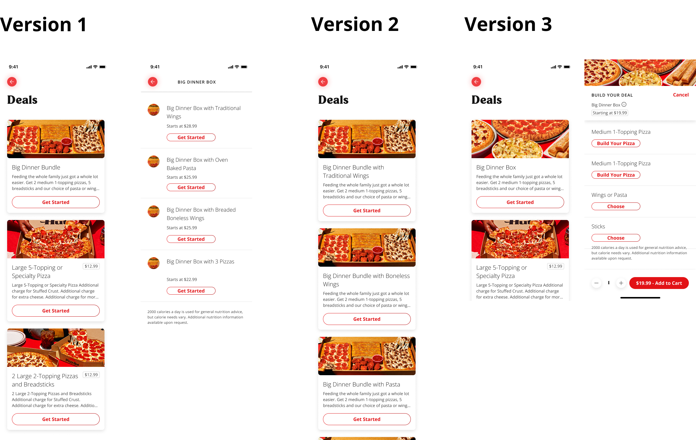 The testing confirmed that a linear, guided stepper (pizzas → sides → upgrades → review) best aligned with users’ mental model of “building a meal.”